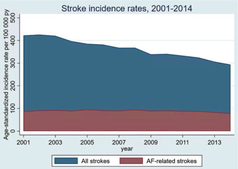 Det gjør at andelen hjerneslag som skyldes hjerteflimmer økte fra 20,6 prosent til 26,3 prosent i perioden 2001- 2014.
