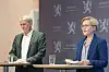 Helse- og omsorgsminister Ingvild Kjerkol (Ap) og assisterende helsedirektør Olav Valen Slåttebrekk under til pressekonferansen der de orienterte om endringane i fastlegeordningen.